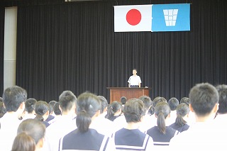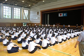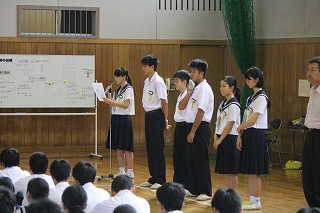 月曜日の朝会は、8時15分のチャイムと同時に体育館で行われます。しかし、開始3分前には全員が一言もしゃべらず、座って静かに待つことができています。また、生徒会の生徒が上手に司会をしてくれますし、校長先生とのあいさつは大きな声でしっかりできていて、話を聞くときはどの生徒も前を向いて相手の顔を見ています。毎回常中生のすばらしさを感じさせる朝会です。 (いし)