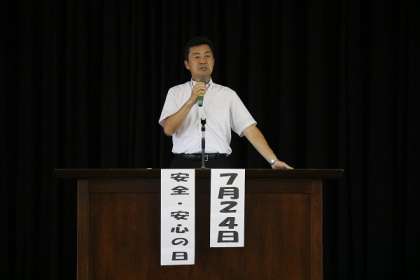 「7月24日」この日はどんな日か知っていますか?常滑市はこの日を「安全・安心の日」としています。なぜこの日が安全・安心の日になっているかは、小学校でも聞いて分かっていますね。平成21年7月24日。常滑西小学校の5年生だった下村まなみさんが、キャンプ中に行方不明になり、今も見つかっていません。大変悲しい出来事です。このことを私たちは忘れてはいけません。みんなは普通に学校に来て、授業を受け、友達と話し、部活をして、無事に家に帰るのがあたりまえでなければいけません。自然災害に備えることも、登下校中の交通事故に会わないことも、いじめをなくすことも、一人一人の安全安心につながります。7月24日の意味をよく考えてください。