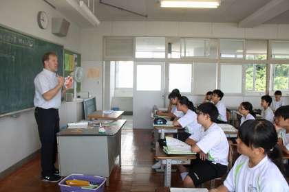 ALTのMark先生が店員で、生徒が買い物客になり、英語で買い物をします。