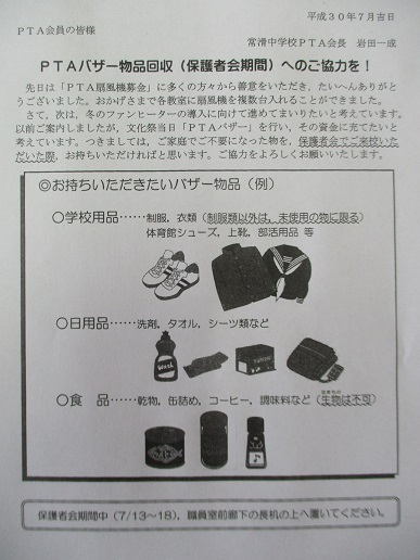 本日、「バザー物品回収への御協力を」の案内を配布しました。