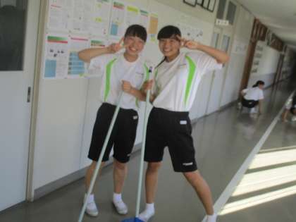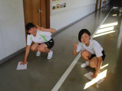 7/10 3年 心を磨く3 公開日 2018/07/10 更新日 2018/07/10 校長より 校長室前廊下の掃除です。 A組女子です。 この笑顔がたまりません。 廊下を磨いて、 心を磨いてくださいね! いいね(0)