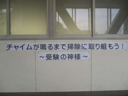 10/23 チャイムが鳴るまで掃除に取り組もう 公開日 2018/10/23 更新日 2018/10/23 校長より 3年生の廊下に、掃除スローガンが掲示してあります。 「チャイムが鳴るまで掃除に取り組もう」 受験の神様からのお願いです。 しっかりとやっていましたよ! いいね(0)