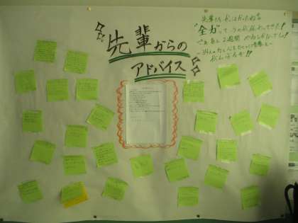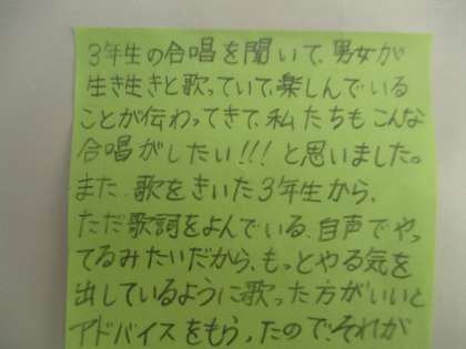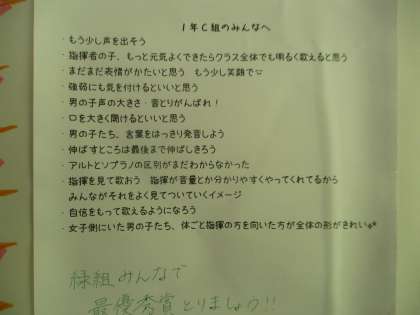 10/29 先輩からのアドバイス 公開日 2018/10/29 更新日 2018/10/29 校長より 1年C組の掲示です。 体育祭で同じ緑組だった先輩が、1Cの合唱を聞いてアドバイスをしてくれたのです。 1年生にとっては、初めての合唱コンクールです。 分からないことばかりなので、先輩からのアドバイスは貴重です。 アドバイスを受けて、1年生も多くのことを学びます。 2年後、今度はあなたたちがアドバイスをする番になります! いいね(0)