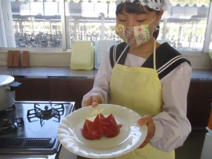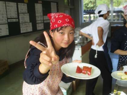 1年D組の家庭科です。 うさぎリンゴがきれいにできました! 上手ですね!