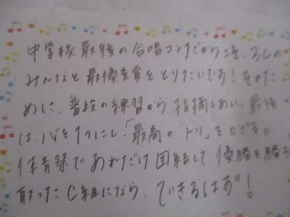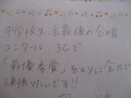 合唱コンクールにかける思いを、クラス全員が書いています。