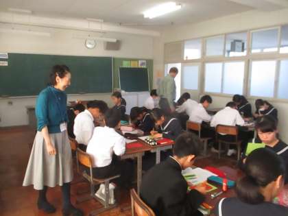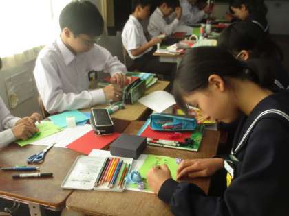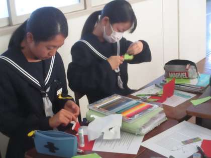 11/7 ちょっと早いですが 公開日 2018/11/07 更新日 2018/11/07 校長より 1年D組の英語です。 クリスマスカードを作っています。 赤や緑の画用紙が机に広がります。 もちろん、言葉は英語で書きます。 ついこの間まで、半そでだったのに・・・。 いいね(0)