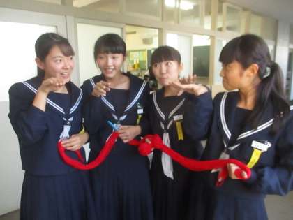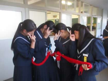 2Cの前を通ると、女子が赤い毛糸を持っています。