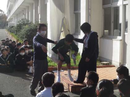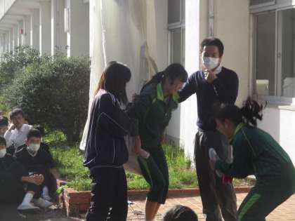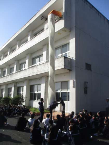 3年生は1・2年と違って、らせん状に降りる救助袋です。