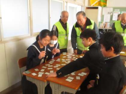12/19 百人一首 公開日 2018/12/19 更新日 2018/12/19 校長より 1年D組の国語です。 懐かしの百人一首をしていました。 札をとるのがとても速い子もいます。 覚えているのでしょうね。 子どもたちは家でもやるのだろうか? 男女仲良く、ルールを守って行う姿が見られましたよ。 いいね(0)