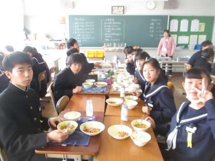 1/8 2A給食訪問 公開日 2019/01/08 更新日 2019/01/08 校長より 2年A組に給食訪問しました。 カメラを向けると、快く振り向いてくれました。 ありがとう。 「え〜、今日もカレーなの〜。」 何てことを言う子はいません。(と思う) 余ったれんこんチップスは、崩れたものまで男の子が食べ尽してくれました。 えらい! いいね(0)