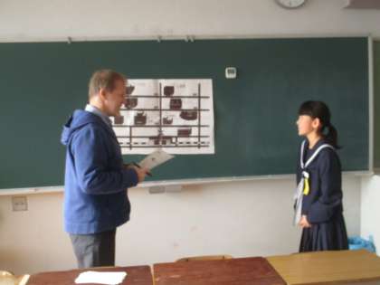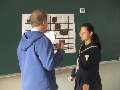 1/23 英語で道案内 公開日 2019/01/23 更新日 2019/01/23 校長より 1年D組の英語です。 一人一人、マーク先生に道を聞かれます。 行き方を英語で案内しなければいけません。 あらかじめ練習はしているものの、やっぱり緊張します。 しかも校長が横で写真を撮っているとなると・・・。 D組さん、よくがんばりました! いいね(0)