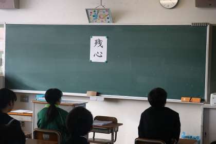 卒業まであと一ヶ月になりました。今日、皆さんに伝えたいことはこの言葉です。読み方は「ざんしん」と読みます。「残心」という言葉は、日本伝統の剣道や柔道など、武道の世界に伝わる言葉です。この言葉には2つの意味があります。
