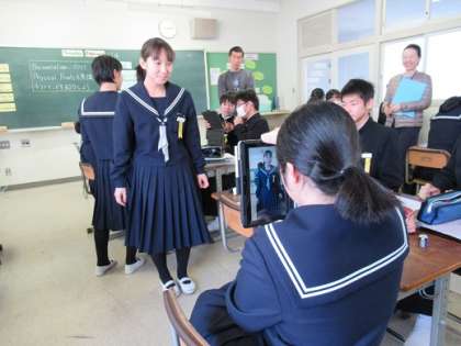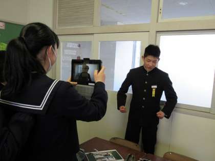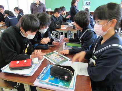 2/12 4コマ漫画を題材に 公開日 2019/02/12 更新日 2019/02/12 校長より 同じく3Bの英語です。 簡単な4コマ漫画のセリフを、英語でプレゼンする活動です。 4人が一コマずつ担当します。 グループでストーリーは相談して決めます。 プレゼンの発表態度は、 「笑顔」「聞きやすい声」「ジェスチャー」「アイコンタクト(全体を見ながら)」「ボディーランゲージ」 に気を付けます。 タブレットで自分の発表している様子を見合います。 いいね(0)