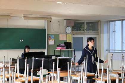 3年生を送る会で歌う曲の指揮者と伴奏者は登校していたので、本番通りやってもらいました。2人とも堂々としていました。本番に期待しています!(いな)