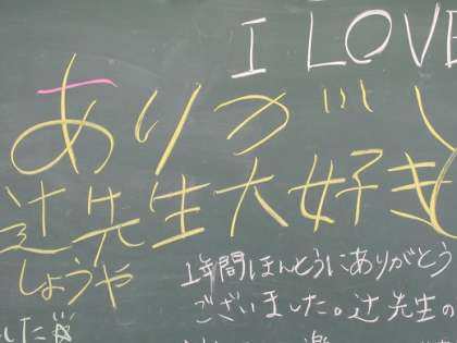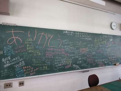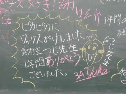 3/1 子どもたちの思い 公開日 2019/03/01 更新日 2019/03/01 校長より 美術室の黒板です。 びっしりと書かれた感謝の言葉。 美術のT先生は勤務の関係で毎日常中にいるとは限りません。 T先生とは3年生になってからのたった1年間の指導でした。 子どもたちには年数は関係ないのです。 その時、先生がどれだけ自分たちのために一生懸命に関わってくれたか。 この黒板が、子どもたちとT先生の関わりを物語っています。 いいね(0)
