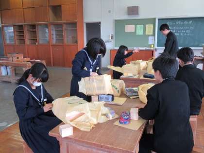 3/12 持ち帰り 公開日 2019/03/12 更新日 2019/03/12 校長より 1年B組の技術です。 木工作品が出来上がりました。 T:「満足のいく出来栄えだった?」 S:「う〜ん。あんまり・・・。」 持ち帰る準備をしています。 材料の木材が入っていた袋に入れて持ち帰ります。 ちょっとかさ張ります。 帰りの自転車の運転には気を付けてくださいね! いいね(0)