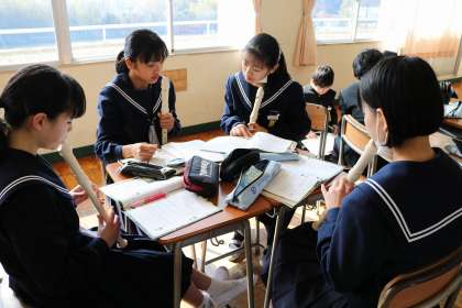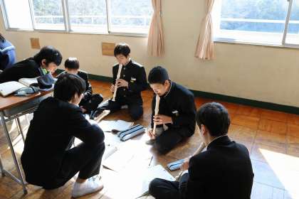 今、1・2年生の音楽の授業は創作(作曲)を中心に学習しています。2年生は「動機を生かした旋律」を作っています。今回の動機は「自分の誕生日」です。誕生日の数字4つをドレミ…に当てはめて1小節。それをくり返したり反対から並べたり。偶然の重なりをリコーダーで演奏してみると、これがどうして、音楽っぽくなります。さらに自分好みにしようと試行錯誤。どんな曲になったでしょうか。楽譜を書くのに慣れない子も多いので、教え合いながら進めました。(いな)
