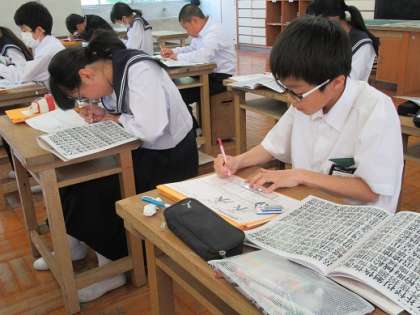 5/17 レタリングで「常滑中学校」 公開日 2019/05/17 更新日 2019/05/17 校長より 1年D組の美術です。 レタリングの授業です。 明朝体で「常滑中学校」を書きます。 みんな集中して書いています。 でも中には消しゴムを使った時、まちがえて紙を破ってしまう子もいました。 ドンマイ! いいね(0)