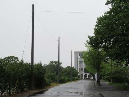 校舎へ向かうイチョウ並木の横に電信柱が登場です。