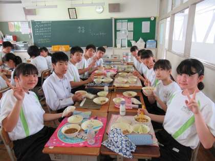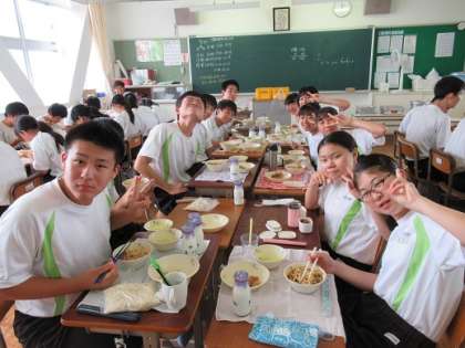 今日の給食は「なす入り肉みそかけソフトメン」です。