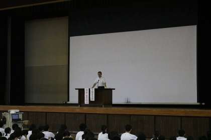 今日は常滑中学校の生徒として、必ず知っておいてほしいことを話します。それは「7月24日」のことです。7月24日と聞いて、「あっ、あのことだ」と気付く人も多いと思います。それは、10年前の7月24日、当時常滑西小学校の5年生だった下村まなみさんが、キャンプ中に行方不明になったことです。まなみさんは朝の散策中に突然姿が見えなくなりました。警察も消防も学校関係者も、みんなで探しましたが見つかりませんでした。その後、まなみさんは行方不明のまま常西小を卒業し、常滑中学校に入学しました。しかし残念なことですが、一度も登校することがなく卒業しました。あれから10年、まだ見つかっていません。
