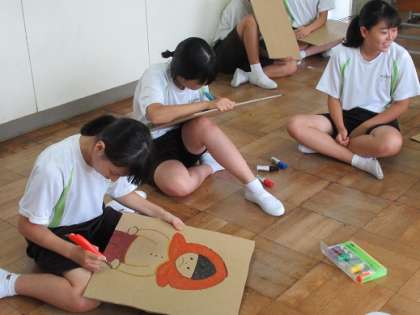 3年A組です。 段ボールに何やら絵を描いていますね?