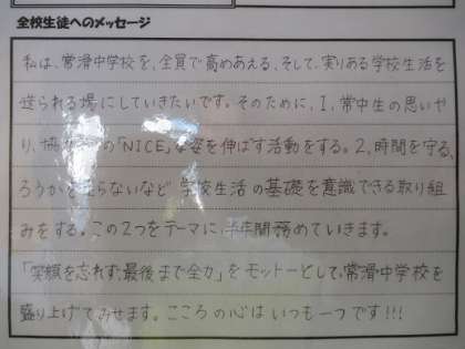 10/10 生徒会からのメッセージ 公開日 2019/10/10 更新日 2019/10/10 校長より 後期生徒会役員の紹介が中央渡り廊下に掲示してあります。 全校生徒へのメッセージがいい。 どれもいい! ぜひ見てほしい。 いいね(0)