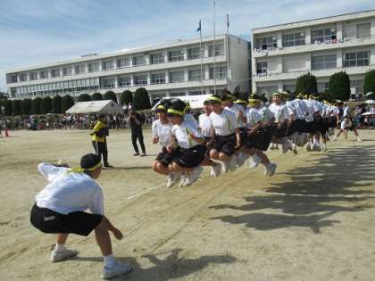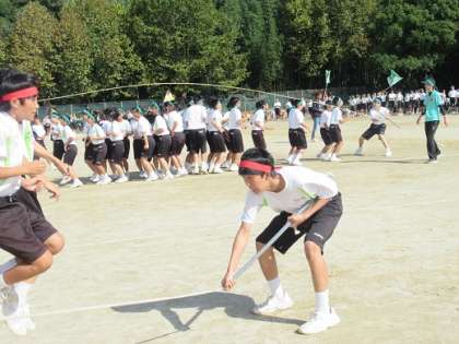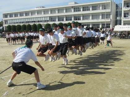 2年生の大縄跳びです。 どのクラスも接戦。 回し手が一番しんどい。