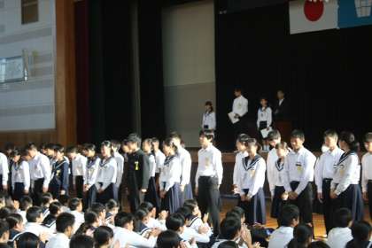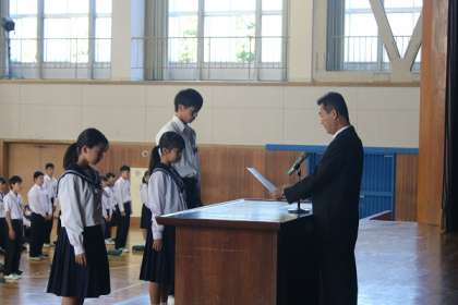 10/28 学級三役の任命 公開日 2019/10/28 更新日 2019/10/28 校長より 朝会で、後期学級三役の任命を行いました。 学級三役とは、「級長」「副級長」「書記」の男女各1名ずつの6名です。 学年主任から名前を呼ばれると、 「はい!」 凛とした爽やかな返事です。 各学年の代表1名が壇上で任命状を受け取りました。 後期の学級や学年を頼みます! いいね(0)