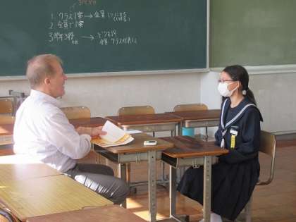 11/14 ALTとフリートーク 公開日 2019/11/14 更新日 2019/11/14 校長より 2年D組の英語です。 マーク先生と個別にフリートークしました。 (上、中)何を聞かれるのかドキドキです。ちょっと緊張しながら答えています。 (下)廊下で順番を待つ2人。ピースする余裕もあるね。 いいね(0)