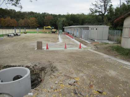 緊急時に消防車等の大型車両が出入りできるように、正門横の拡張工事を行っています。