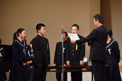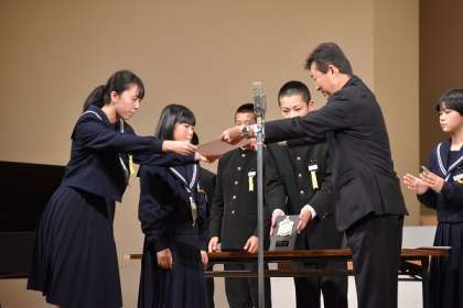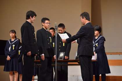 12/7 表彰式 公開日 2019/12/07 更新日 2019/12/07 校長より 表彰式の様子です。 賞をもらったのは2クラスですが、みんなよかった。 すべてのクラスに「感動賞」を贈呈です! ○1年の部 最優秀賞 1年E組(上) 優秀賞 1年B組 ○2年の部 最優秀賞 2年A組(中) 優秀賞 2年B組 ○3年の部 最優秀賞 3年D組(下) 優秀賞 3年E組 ○感動賞 すべてのクラス いいね(0)
