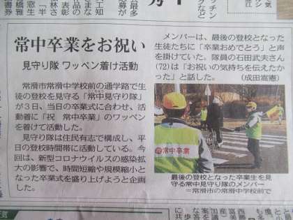 3/5 今朝の中日新聞です! 公開日 2020/03/05 更新日 2020/03/05 校長より 本日、見守り隊の記事が新聞に掲載されました。 卒業式の朝の内容です。 うれしい限りです! いいね(0)