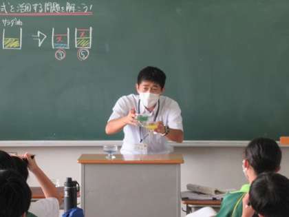 9/17 実物で関心を高める 公開日 2020/09/17 更新日 2020/09/17 校長より 1年生の数学です。 T先生は授業でいろいろな工夫をします。 これは比例式の例題を理解するために、実物を使って説明しています。 視覚に訴えることで分かりやすくなる子も多いです。 いいね(0)