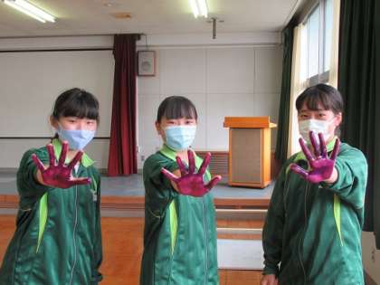 2年A組女子が手形を押しました。 紫色もかっこいい! 全員上手に押すことができました。