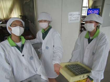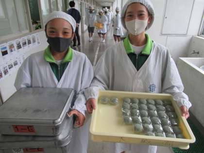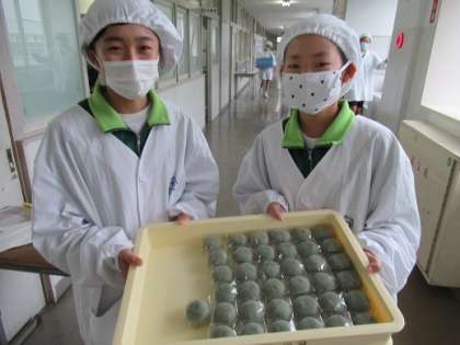 1年生の給食当番です。 大蔵餅の草餅を運んできました。 美味しくいただいたかな?