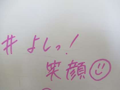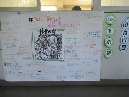 10/12 よしっ!笑顔 公開日 2020/10/12 更新日 2020/10/12 校長より 2年E組の体育の部に向けての掲示です。 「よしっ!笑顔☺」 終わった後、みんなの笑顔が見たい! いいね(0)