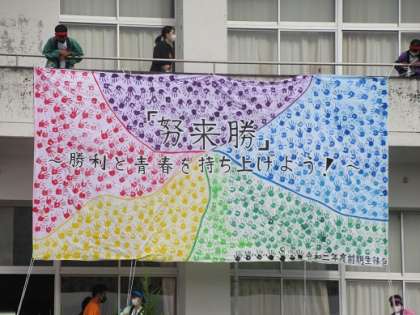 開会式でビッグアートを披露しました。 全校生徒、職員の手形です。 すごいなあ〜!