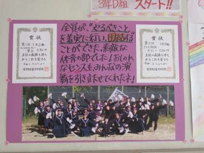 背面の掲示板には学校祭体育の部の思い出が貼ってあります。(下)