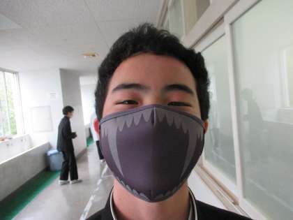 おもしろいマスクをした男の子を発見! 頼んだら写真OKしてくれました。 ガォ〜!