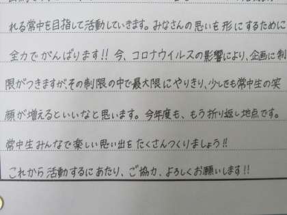11/12 生徒会役員の紹介 公開日 2020/11/12 更新日 2020/11/12 校長より 生徒会役員の紹介文が掲示してありました。 一人一人の思いが書かれています。 共通するのは、 「常中のために」「みんなの笑顔のために」 この思いを常中生全員で共有したい! いいね(0)