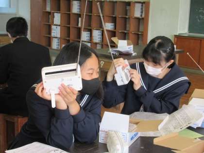 11/12 聞こえたよ 公開日 2020/11/12 更新日 2020/11/12 校長より 2年E組の技術です。 ラジオが完成したので聞いていました。 AM・FMなどいろいろな放送局を聞きます。 自分が作ったラジオから音が出ると、うれしいでしょうね! いいね(0)