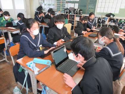3/16 スライドを作る 公開日 2021/03/16 更新日 2021/03/16 校長より 1年F組の国語です。 「方言と共通語」の単元で、グループで調べてことをスライドにまとめていました。 後日、発表会を開くそうです。 chromebookを使って初めての発表です。 どんな発表になるのか楽しみですね。 いいね(0)