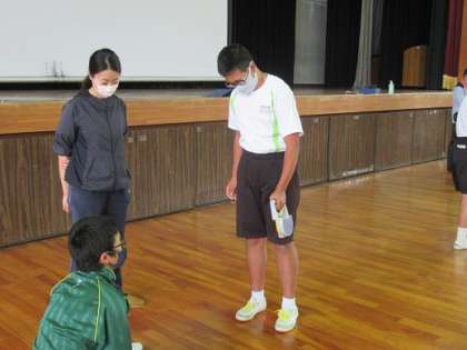 体力テストの握力です。 足と手を伸ばして一気に力を入れます。 パワーは出せたかな?