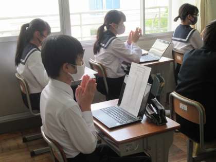 5/13 生徒総会3 公開日 2021/05/13 更新日 2021/05/13 校長より 教室の様子です。 (上)拍手で賛成の意思を表します。 (下)総会の要項はchromebookを活用して見ます。ペーパーレスです。 いいね(0)