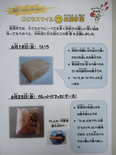 5/27 復活、スマイル給食! 公開日 2021/05/27 更新日 2021/05/27 校長より 昨年度、コロナで大変な学校生活を送る子どもたちを応援しようと、常滑市は給食に予算をつけちょっと豪華なスイーツをつけてくれました。 今年もやります! やるなあ〜、常滑市! いいね(0)