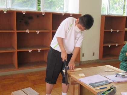 6/8 木を切る 公開日 2021/06/08 更新日 2021/06/08 校長より 1年7組の技術です。 ペンスタンドの制作です。 木を固定し、のこぎりで木を切ります。 まっすぐに切ることはできたかな? いいね(0)