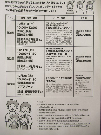 常滑市教育委員会生涯学習課が主催する家庭挙育セミナーが開催されます。
