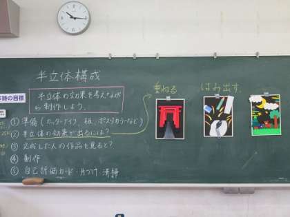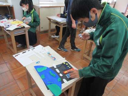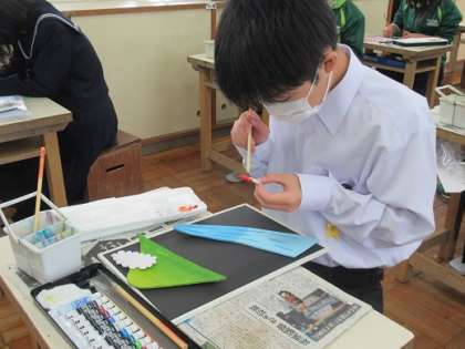 1年3組の美術です。 半立体構成作品の彩色です。 静かに集中して取り組んでいます。 すごいです!