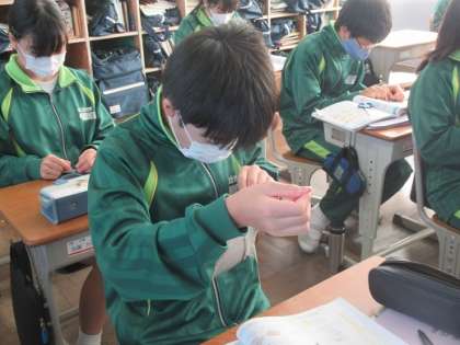 11/15 かがりぬい 公開日 2021/11/15 更新日 2021/11/15 校長より 1年3組の家庭科です。 手縫いで「かがり縫い」の練習をしました。 T:「小学校の時も裁縫はやったかな?」 S:「やりました。でも波縫いだったのでこれは初めてです。」 ちょっと難しいかがり縫いにチャレンジしました! いいね(0)